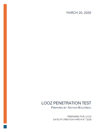 White‑box penetration test on Looz’s VM. Discovered 4 critical/high findings including exposed WordPress credentials, open SSH with root escalation, outdated PHP & WordPress core. Delivered full technical report with CVSS scoring and remediation steps.
